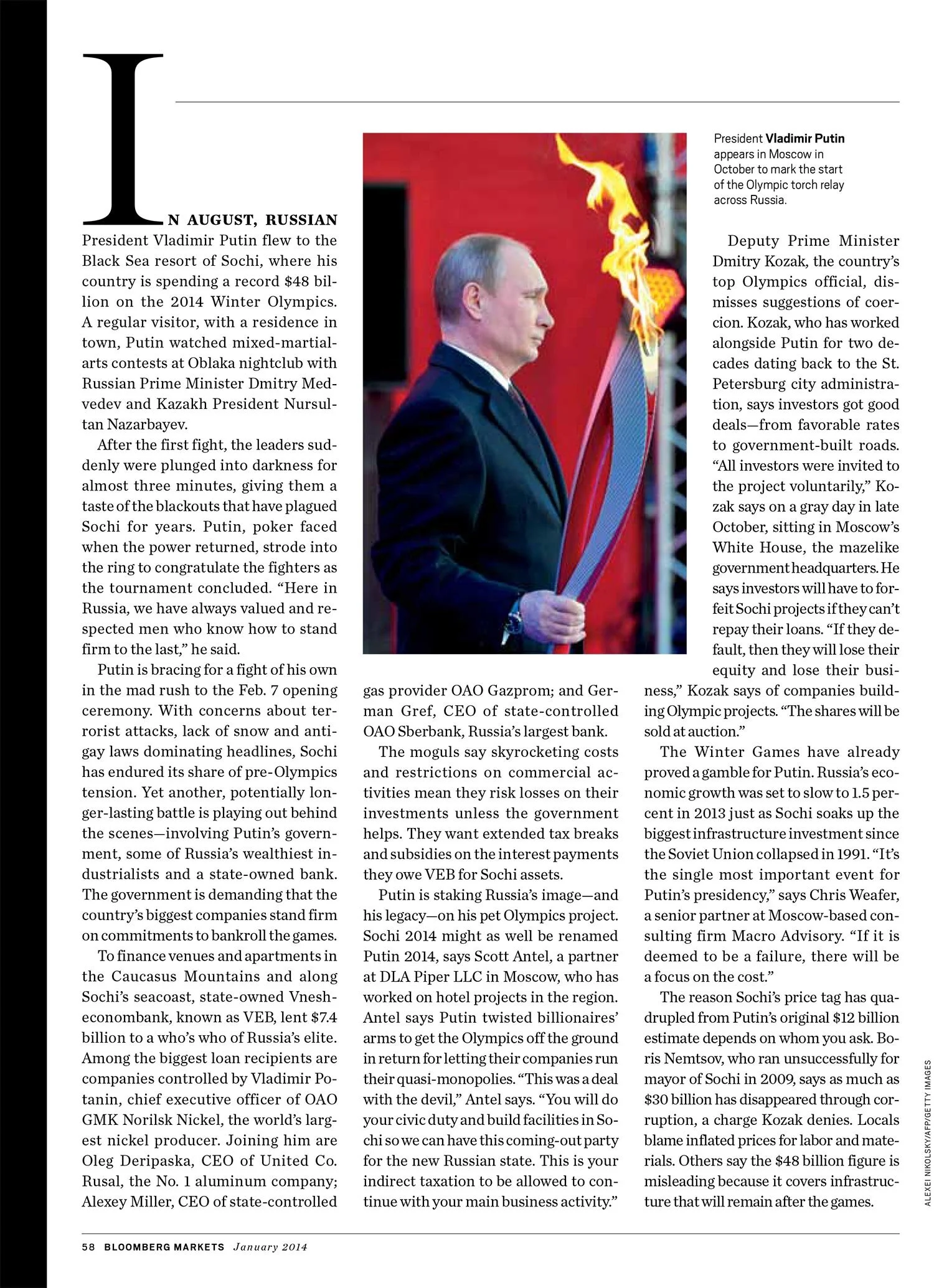In August, Russian President Vladimir Putin flew to the Black Sea resort of Sochi, where his country is spending a record $48 billion on the 2014 Winter Olympics. A regular visitor, with a residence in town, Putin watched mixed-martial arts contests at Oblaka nightclub with Russian Prime Minister Dmitry Medvedev and Kazakh President Nursultan Nazarbayev. After the first fight, the leaders suddenly were plunged into darkness for almost three minutes, giving them a taste of the blackouts that have plagued Sochi for years. Putin, poker faced when the power returned, strode into the ring to congratulate the fighters as the tournament concluded. “Here in Russia, we have always valued and respected men who know how to stand firm to the last,” he said. Putin is bracing for a fight of his own in the mad rush to the Feb. 7 opening ceremony.